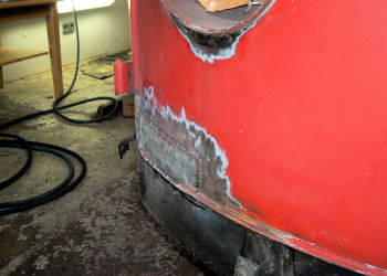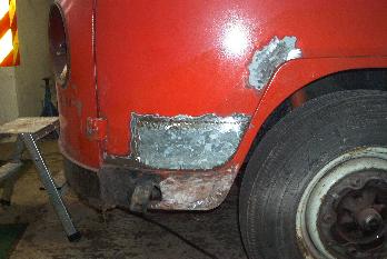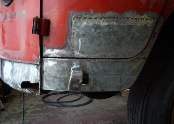 An einigen Stellen waren Durchrostungen die geschweißt werden mußten, also entfernt man den Rost und schneidet die angerosteten Stellen großzügig heraus danach fertigt man ein Blech an welches über die offene Stelle aufgeschweißt wird.